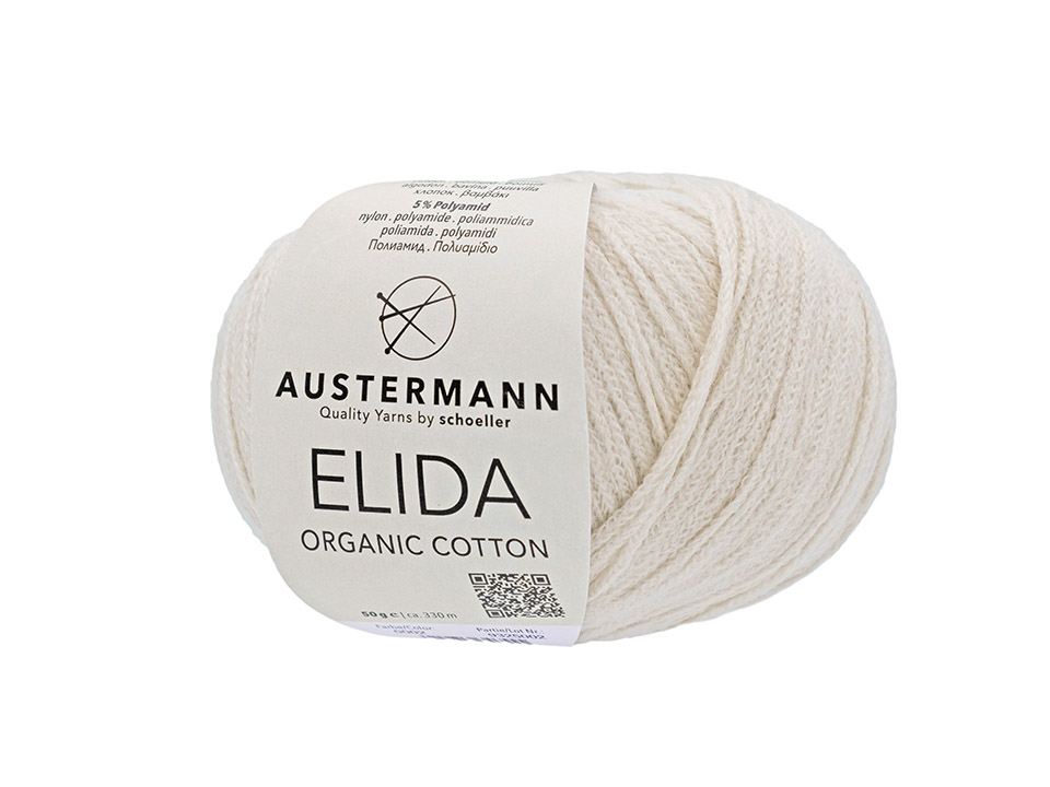Austermann Elida ist ein weiches, vielseitiges Garn, das sich besonders gut für leichte Kleidungsstücke, Accessoires sowie feinere Strick- und Häkelprojekte eignet. Es gehört zur Kategorie der klassischen Sommer- und Übergangs-Garne mit hohem Baumwollanteil und einem kleinen Anteil an Kunstfaser für Formstabilität und Strapazierfähigkeit. Das Garn fühlt sich angenehm weich an und lässt sich gut verarbeiten – sowohl zum Stricken als auch zum Häkeln.