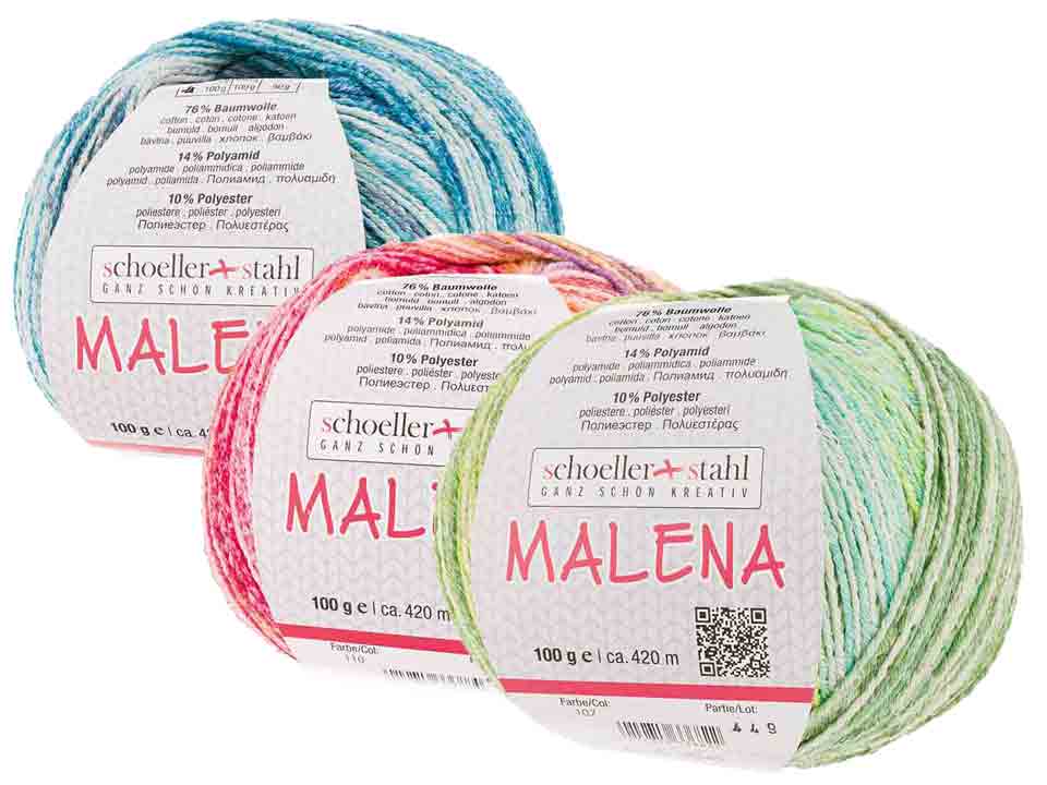 Malena ist ein leichter, farbenfroher Garnklassiker mit einem hohen Anteil an Baumwolle, kombiniert mit robusten Kunstfasern. Es eignet sich ideal für sommerliche Strick- und Häkelprojekte, die bequem, atmungsaktiv und gleichzeitig pflegeleicht sein sollen. Durch die Lauflänge eignet sich auch gut für Socken. Aber durch die Zusammensetzung ist auch sehr beliebt für Babybekleidung.