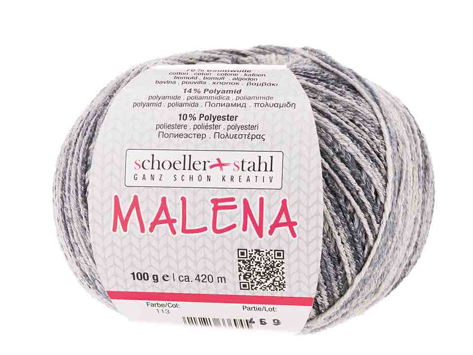 Malena ist ein leichter, farbenfroher Garnklassiker mit einem hohen Anteil an Baumwolle, kombiniert mit robusten Kunstfasern. Es eignet sich ideal für sommerliche Strick- und Häkelprojekte, die bequem, atmungsaktiv und gleichzeitig pflegeleicht sein sollen. Durch die Lauflänge eignet sich auch gut für Socken. Aber durch die Zusammensetzung ist auch sehr beliebt für Babybekleidung.